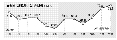그러나 금감원 관계자는 “지난해 하반기에 손해율이 급격하게 회복된 것은 사실이지만 2008 회계연도를 기준으로 따져 보면 손해율은 69.6% 수준”이라면서 “당장 보험료를 올리기는 어려울 것”이라고 말했다.
