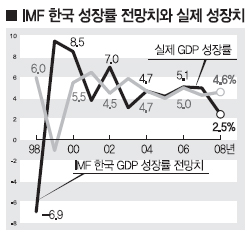 IMF 전망과 실제 성장률 사이의 차이는 이후에도 상당했다. 2000년에는 6.5% 성장할 것이라고 예측했지만 실제는 3.8% 성장에 그친 데 이어 ▲2001년 4.5% 전망 7.0% 성장 ▲2002년 7.0% 전망 4.5% 성장 ▲2003년 5.9% 전망 3.1% 성장 등으로 차이는 여전했다. 이후 IMF는 2004년 경제성장률 4.7%를 정확히 맞히기도 했지만 2007년, 2008년 전망과 실제 성장률 오차는 각각 0.7%포인트, 2.1%포인트로 벌어졌다.