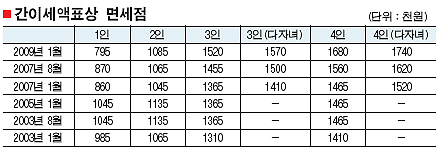 독신가구의 면세점은 소득세법 및 시행령 개정 등으로 인해 2005년 1월∼2006년 12월 104만 5000원에서 2007년 1∼7월 86만원, 2007년 8월∼2008년 12월 87만원, 올해 79만 5000원 등으로 전반적으로 계속 내려가는 추세다. 반면 배우자와 자녀 2명을 두고 있는 4인가구 근로자의 경우 올해 월급 174만원, 연봉 2088만원 미만이면 소득세를 면제받게 된다.