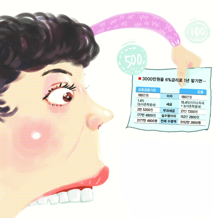 연리 6%의 예금상품에다 3000만원을 넣는다고 가정할 때 1년 뒤 세금을 제하고 시중은행에서 받을 이자는 152만 2800원이다. 그러나 이 돈을 신협이나 새마을금고 등에 넣는다면 177만 4800원을 이자로 받게 된다. 이자가 같아도 소득세 감면 덕에 25만 2000원을 더 챙길 수 있는 것이다. 세금을 낸 후 실수령액을 따져 보면 시중은행보다 상호금융기관을 이용할 때 16.5%나 이자소득을 더 받는다는 계산이다.