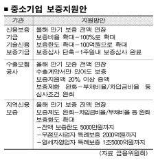 우선 올해 만기가 돌아오는 30조 9000억원 규모의 보증 전액의 만기를 1년 연장한다. 또 대출액의 95%를 보증하던 것을 100% 보증으로 바꿨다. 경기침체로 매출은 줄고 빚은 늘 수밖에 없는 기업 사정을 감안해 보증서 발급에 필요한 매출액, 채무액 등의 재무제표 기준들도 크게 완화했다. 여기에다 속도도 높였다. 신용보증기금이나 기술보증기금 등 보증기관과 은행간 협약을 통해 100% 정부보증의 경우 은행이 별도 심사없이 바로 대출키로 했다. 보증심사기간도 1주일로 줄였다.