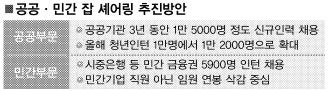 일자리 대란 타개를 위한 잡셰어링의 온도차가 확연해지고 있다. 공공 부문에서는 신입사원 초봉 삭감에 따른 신규 일자리 창출과 행정인턴·청년인턴 확대 등 두 가지 방식으로 잡셰어링 바람이 뜨겁게 불고 있지만 민간 부문은 냉랭한 분위기다.16일 재정경제부 등에 따르면 정부가 각 공공기관에 선진화 과정에서 축소되는 인원의 절반만큼을 신규 채용할 것을 유도하면서 신입 추가 채용을 위한 초임 삭감 폭도 윤곽이 잡히고 있다.