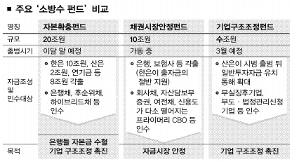 ‘실패한 처방전’으로 낙인찍히는 듯했던 ‘자본확충펀드’가 다시 힘을 얻으면서 정부의 ‘펀드 해법’에 관심이 쏠리고 있다. 현재 정부가 내놓았거나 내놓을 예정인 펀드는 자본확충펀드, 채권시장안정펀드, 기업구조조정펀드 크게 세 가지다. 이들 정책펀드는 수익률 극대화가 목적인 일반 펀드와는 태생과정이나 목적부터 확연히 다르다. 삼총사 펀드가 정부 의도대로 위기 극복의 해결사가 될 지 주목된다.