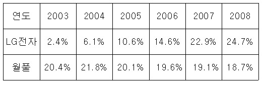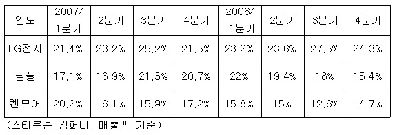 이로써 LG전자는 2007년 연간 매출액 점유율 22.9%에서 2008년 24.7%로 확대해 선두 자리를 굽건히 지켰다.반면 2위인 월풀(Whirlpool)의 하향세는 두드러졌다. 매출액 점유율은 3·4분기 대비 2.6% 떨어진 15.4%를 기록,2002년 이후 최저치로 추락했다.