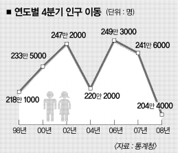 18일 통계청이 발표한 ‘2008년 국내 인구이동 통계’에 따르면 지난해 4분기 이동자수는 204만 4000명으로, 2007년 4분기 241만 6000명보다 15.4%(37만 2000명) 감소했다. 이는 외환위기 때인 1998년 4분기 218만 1000명은 물론 203만 2000명을 기록한 1980년 4분기 이후 28년 만에 최저치다.