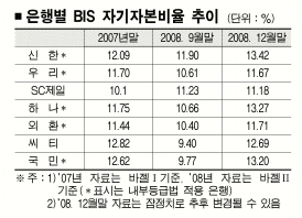 국내은행의 BIS 비율은 2007년말 12.31%에서 지난해 9월 말에는 10.86%까지 내려갔었다. 기본자본비율은 2007년 말 8.97%에서 지난해 9월 말 8.33%까지 떨어졌다가 지난해 말에는 8.79%로 개선됐다.
