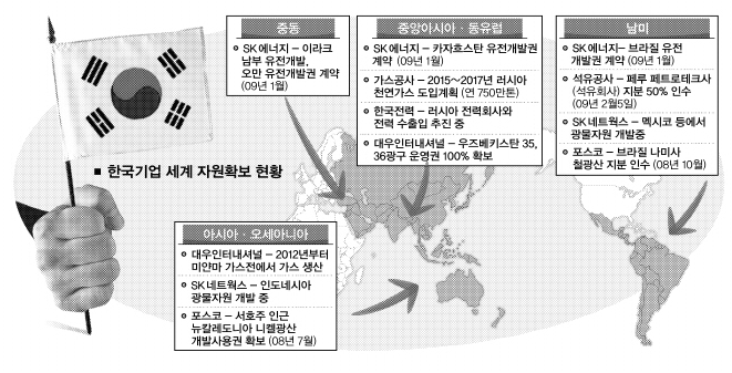 최근 들어 우리 기업들이 석유·천연가스·전력 등 자원을 확보하기 위해 앞다퉈 해외시장에 뛰어들고 있다. 해외 유전은 불황으로 가격이 급락해 싼값일 때 사두면 나중에 도움이 된다는 판단에서다.