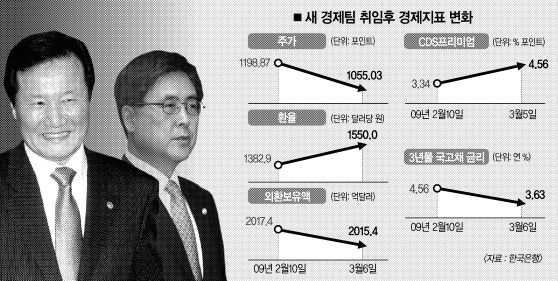 9일로 출범 한 달을 맞는 새 경제팀에 대한 시장의 반응이다. 부처간 엇박자나 정책 균열음은 눈에 띄게 줄었으나 경제 자체는 한 달 전보다 악화됐다. 새 경제팀의 잘못된 처방이 경제 악화를 초래한 것은 아니지만 ‘3월 위기설’에 대한 안이한 대처 등 해외 불신감을 걷잡을 수 없이 증폭시킨 것은 뼈아픈 실책으로 지적된다. 한·미 통화 스와프 규모 확대를 끌어 내지 못한 것도 아쉬움으로 꼽힌다.