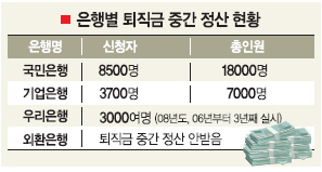 금융권에 따르면 국민은행은 지난달 실시한 퇴직금 중간정산에서 전체직원(1만 8000명)의 절반 가까운 8500명이 신청했다. 기업은행도 노조의 요구로 지난달 7000명 중 3700명이 퇴직금을 지급 받았다.