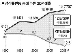 국민소득은 추산이 어려워 1인당 GDP가 미리 가늠해 보는 잣대로 쓰인다. 1인당 GDP는 1995년 1만 1471달러로 1만달러 시대에 처음 진입했으나 외환위기를 겪으면서 1998년 7477달러로 곤두박질쳤다. 2000년 1만 888달러로 다시 1만달러를 회복한 뒤 2007년 2만달러를 처음 돌파했다.