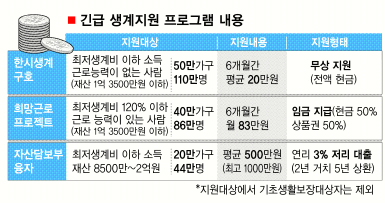 정부는 기초생활보장 수급 혜택을 받지 못하면서 생계에 어려움을 겪는 사람들을 위해 세 가지의 맞춤형 저소득층 지원 프로그램을 마련했다. 우선 가구 소득이 최저생계비(4인 가구 월 133만원)에 못 미치고 연로, 장애, 질환 등으로 근로능력이 없는 50만가구(110만명)에 6개월간 최대 35만원(1인 가구 12만원, 2인 19만원, 3인 25만원, 4인 30만원, 5인 이상 35만원)을 현금으로 주기로 했다.