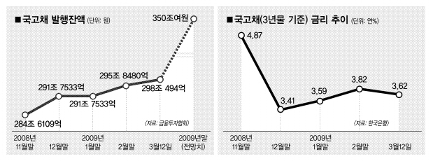 이렇게 되면 대규모 국채 물량이 시장에 쏟아지게 되고, 공급 과잉은 국채 금리 상승(채권값 하락)→시중금리 상승의 악순환을 초래할 수 있다. 경기부양을 위한 재정정책이 도리어 민간소비와 기업투자를 위축시키는 구축효과를 야기할 수 있다는 경고가 나오는 이유다.공동락 하나대투증권 연구원은 “발행 규모가 너무 크다.”며 “물량을 제대로 소화하지 못하면 채권시장 전체가 일시 패닉(공황)에 빠질 위험이 있다.”고 경고했다. 윤 장관은 이날 영국 출국에 앞서 기자들과 만나 “시장에 유동성이 많아 큰 문제가 없을 것”이라며 “현재로선 구축 효과 소지가 크지 않다.”고 반박했다.
