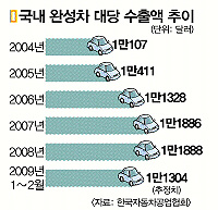이에 따라 대당 수출 가격도 지난해 1∼2월 평균 1만 2909달러에서 올 1∼2월엔 1만 1304달러로 줄었다. 그동안 국내 완성차 수출 단가는 2000년 7386달러에서 2004년 1만 107달러로 첫 1만 달러를 돌파한 뒤 2007년 1만 1886달러, 지난해 1만 1888달러 등 지속적으로 증가세를 보였다. 그러나 올 1월 1만 124달러로 첫 감소세로 바뀌었다.