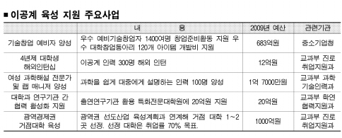 교과부는 이와 함께 지난해 12월 지식경제부가 ‘광역경제권별 신성장 선도사업’을 발표한 데 맞춰 각 광역권별로 인력을 지원할 1~2개의 거점대학을 선정한다.