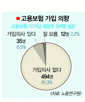 자영업자 541명을 설문조사한 결과 35명(6.5%)만이 가입의사를 밝혔다. 가입을 원하지 않는 이유는 ‘고용보험 납부 부담’(64.2%)이 가장 많았다. 노동부는 실업부조는 현재 정책 고려 대상이 아니라고 밝혔다. 고용보험은 의료보험·국민연금·산업재해보상보험과 함께 4대 사회보장제도의 하나로, 영세 자영업자는 2005년부터 실업자 직업훈련을 정부 비용으로 참여할 수 있으나 실업급여 대상에는 포함되지 않은 상태다.