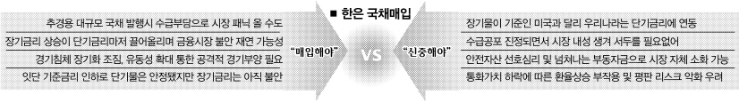 다만 방법론에 있어 한은의 태도는 단호하다. 한은 측은 “정부 발행 국채를 유통시장을 거치지 않고 바로 인수(직매입)하게 되면 발행자의 입맛에 맞게 금리를 싸게 책정할 수밖에 없어 도리어 시장 왜곡을 초래할 수 있다.”고 우려했다. 이성태 총재도 지난 12일 “국채 매입은 마지막 수단”이라며 가능성은 열어놓으면서도 “간접적으로 하겠다.”고 밝혀 유통시장에서의 단순매입을 시사했다. 한은이 국채를 직접 인수한 것은 1994년 1조원대 양곡증권 인수가 마지막이다.