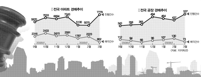 지난해부터 불어닥친 실물경제 침체 여파로 공장들이 경매로 팔려가고 있다. 경매에 부쳐져도 첫 입찰에 응찰자가 없어 몇 차례 유찰되면 감정가의 절반 이하로 헐값에 낙찰된다. 공장뿐 아니라 아파트도 경·공매 물건이 넘쳐나고 있고, 빌딩 매물도 늘어났다.