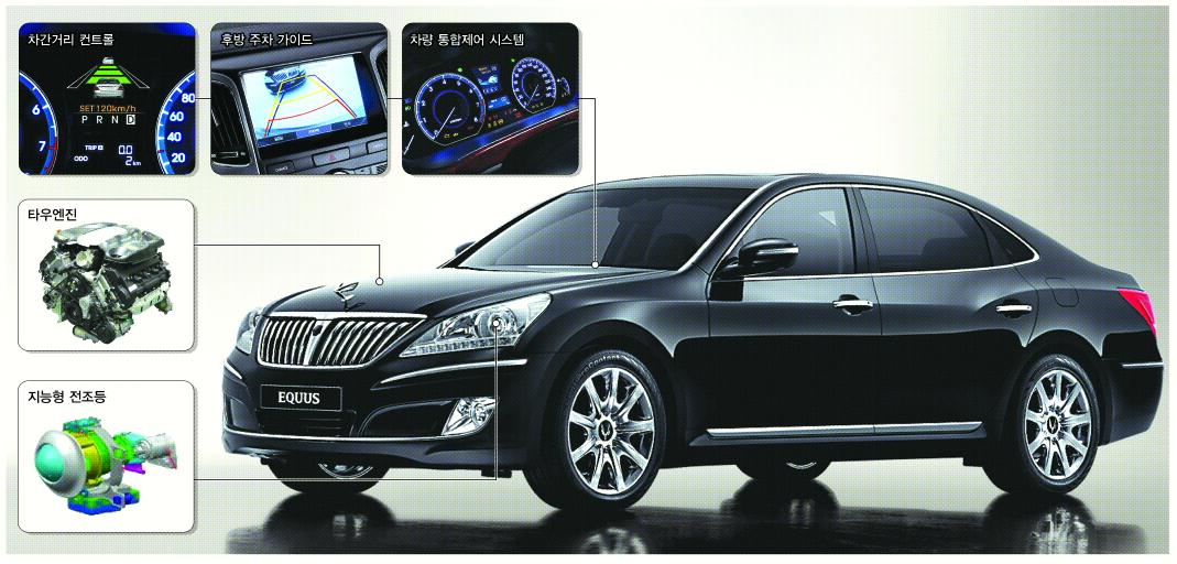 10년만에 재탄생한 신형 에쿠스는 현대자동차의 야심작이다. 3년간 5000억원을 들여 개발한 최첨단 기술과 디자인이 집약돼 최고의 주행·안전·편의성을 갖췄다는 평가를 받는다. 벤츠 S-Class, BMW7시리즈, 렉서스 LS460 등과 당당히 경쟁하는 글로벌 럭셔리 세단으로 자리매김할 전망이다. 신형 에쿠스에 담긴 새 기술과 장치를 알아본다.
