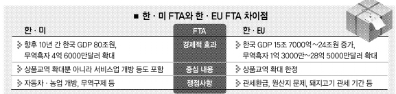 그러나 한·EU FTA는 극심한 사회적 갈등을 불러일으킨 한·미 때와 달리 비교적 조용하게 정리되는 분위기다. 이는 서비스업 개방 등 우리 사회의 전면적인 개편이 불가피했던 한·미와 달리 한·EU FTA는 덜 민감한 상품교역 문제에 집중하고 있기 때문이다.