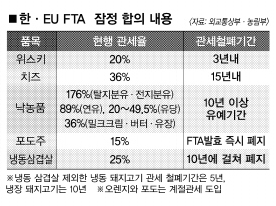 양측은 또 주요 쟁점인 돼지고기(관세 25%)의 경우 냉동 삼겹살과 냉장육은 10년, 냉동육은 5년에 걸쳐 관세를 철폐하기로 했다. 지난해 EU산 돼지고기는 4억 698만달러가 수입됐고, 이중 냉동 삼겹살이 70% 정도를 차지한다.