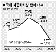 이는 지난해 122만대에 비해 10.3% 줄어든 규모로 98년 외환위기 이후 최저치다. 특히 지난해 판매 감소율이 4.5%였던 것을 감안하면 내수 시장 위축 속도는 훨씬 가팔라지고 있는 셈이다. 올 초 자동차공업협회가 내놓은 판매 감소율 전망치인 9.1% 보다도 상황이 악화된 것이다.
