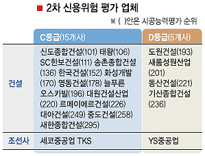 시공능력 101~300위에 드는 70개 건설사와 4개 조선사 가운데 5개 업체가 D등급(부실기업) 판정을 받아 퇴출 절차를 밟는다. 15곳은 워크아웃(기업개선작업) 대상으로 확정됐다. 채권단의 신용위험평가 결과 평가 대상 중소건설·조선사의 27%가 구조조정 대상에 올랐다.