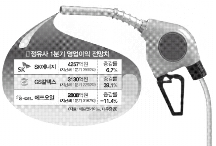 9일 증권정보업체 에프엔가이드와 정유업계에 따르면 SK에너지의 1분기 실적 예상치는 매출 8조 4422억원, 영업이익 4257억원으로 조사됐다. 지난해 같은 기간(매출 9조 4491억원, 영업이익 3990억원)보다 매출은 10.6% 감소했지만, 영업이익은 6.7% 늘어날 것으로 예측됐다. GS칼텍스도 1분기 예상치가 매출 6조 5260억원, 영업이익 3130억원을 달성할 것으로 전망된다. 매출은 지난해 같은 기간보다 7.3% 줄지만, 영업이익은 39.1%가량 늘어난 수치다.