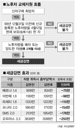 -안 된다. 10년 이상(1999년 12월31일 이전 등록)된 중고차를 4월12일 현재 보유한 사람(법인)이 대상이다. 새 차를 사고 앞뒤 2개월 안에 중고차를 폐차하거나 양도하는 절차도 마쳐야 한다.