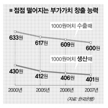 우리 경제의 부가가치 창출 능력이 갈수록 떨어지고 있다. 1000원어치를 생산하면 부가가치는 고작 401원이다. 핵심 버팀목인 수출도 예외는 아니어서 1000