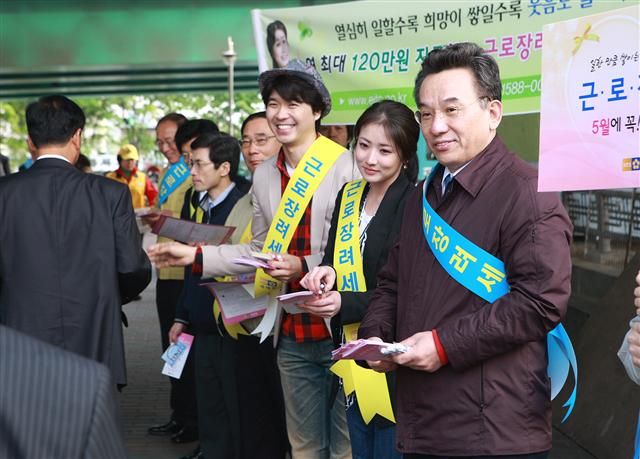 허병익(오른쪽) 국세청장 직무대행이 27일 중소기업들이 밀집해 있는 서울 구로디지털단지를 찾아 ‘근로장려세제 연예인 홍보대사’인 최정원, 박수홍씨 등과 함께 근로장려세 환급에 관한 안내책자를 나줘주고 있다. 올해 처음 시행되는 근로장려세는 일하는 빈곤층(차상위계층 포함)에게 소득세를 돌려주는 제도로 종합소득세 신고 기간인 다음달 1일부터 6월1일까지 관할 세무서에 신청하면 된다.
