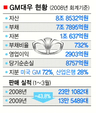GM대우는 지난해 8757억원의 당기순손실을 봤다. 2903억원의 영업이익을 내고도 선물환 등 파생상품 거래에서 1조 4686억원의 마이너스 실적을 기록했다. 올해 안에 상환해야 할 유동성 차입금 규모도 1조 2000억원이 넘는다. 현재 GM대우의 보유 현금은 50 00억∼6000억원 수준으로 알려졌다. GM대우는 산업은행 9300억원을 포함해 은행권의 크레디트라인(신용공여한도) 1조 3700억원을 모두 소진한 상태다.