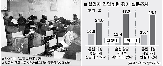 직업훈련 대상자의 선발이 적정한지에 대해서도 ‘그렇지 않은 편’ 28.4%, ‘전혀 그렇지 않다.’ 5.6% 등 34.0%가 부정적으로 답해 긍정적이라는 응답(16.9%)의 2배가 넘었다. ‘훈련 과정이 직종별·수준별로 다양하게 구성돼 있는가.’에 대해서도 46.1%가 아니라고 했다.