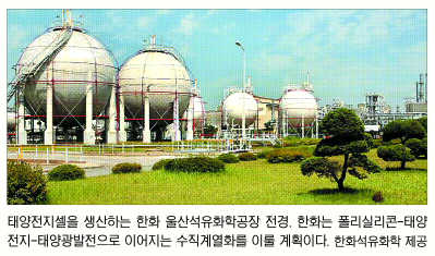 에너지·환경 신사업과 관련, 한화석유화학은 2015년까지 총 8000억원을 투자해 태양광전지뿐 아니라 태양열 집적패널의 기초 소재인 폴리실리콘 사업에 참여한다. 폴리실리콘?태양광전지-태양광발전으로 이어지는 그린 에너지사업의 수직계열화를 갖출 계획이다. 태양전지는 빛을 전기로 바꾸는 장치로 2015년엔 현재의 반도체 시장 규모에 필적할 정도의 급성장이 예상된다. 한화석유화학 관계자는 “나노기술을 적용해 세계일류 수준의 차별화된 태양전지를 대량 생산할 계획”이라고 말했다. 질산 제조공정에서 발생하는 아산화질소를 감축해 이산화탄소 배출권 100만t을 확보한 한화는 중국에서도 폐열회수발전사업으로 모두 20만t의 배출권을 확보했다. 연간 300억원 이상의 수익을 기대하고 있다. 한화S&C는 기존 시스템보다 26%가량 에너지 효율이 좋은 열병합발전사업을 추진 중이다. 여수화학단지 열병합발전소와 군장국가산업단지 내에 125㎿ 규모의 열병합발전소를 짓고 있다.