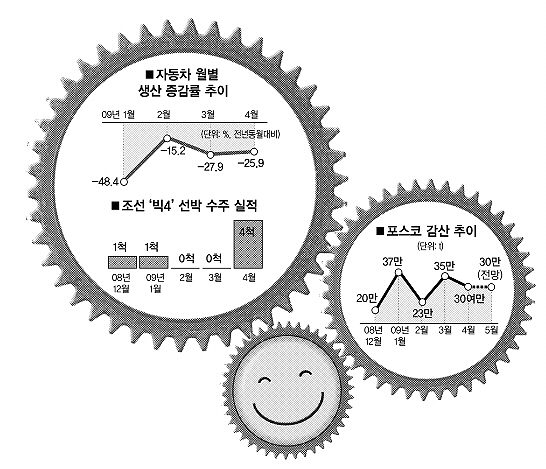 우리 경제의 성장 엔진인 철강·자동차·조선 등 3대 중후장대(重厚長大) 산업에 ‘봄기운’이 감돌고 있다. 정부의 경기부양책과 시장의 기대감 속에 이달 이후 감산폭이 줄고 판매 증가 및 신규 수주가 기대된다.