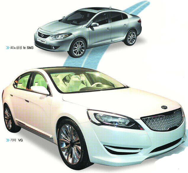 기아차는 준대형차 ‘VG(프로젝트명)’를 하반기 출시할 예정이다. 그랜저TG를 기반으로 개발됐으며, 옆문이 4개인 세단 타입이다. 앞서 ‘KND-5’라는 이름으로 서울모터쇼에서 공개했다. 당시엔 3500㏄ V6 엔진을 장착했다. 고급 세단의 품격을 느낄 수 있는 LED 헤드램프와 호랑이 코와 입 모양을 형상화한 기아차의 패밀리룩 라디에이터 그릴을 적용했다. 전면 유리와 이어지는 파노라마 선루프도 채택할 예정이다.
