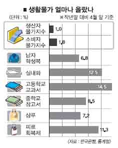 중학교 참고서(8.5%)와 고등학교 교과서(14.5%) 가격은 1996년 이후 13년 만에 가장 높은 오름폭을 보였다. 고교 교과서 값은 지난해 22.8%나 떨어졌다가 반등한 것이어서 학부모들의 체감 고통이 더 클 것으로 보인다. 최근 10년 동안 1%대 상승률에 그쳤던 공책 값도 올 들어 8.6% 올랐다.