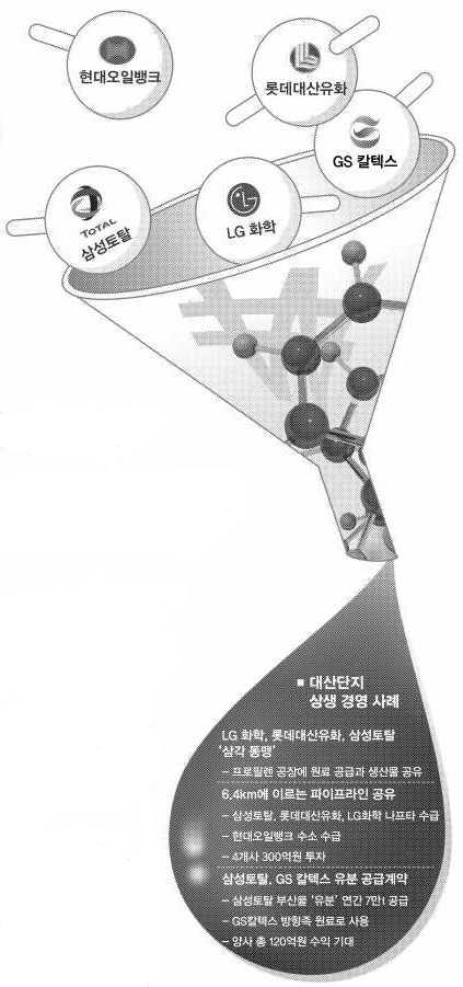 충남 서산시 대산석유화학단지가 삼성, LG, 롯데, GS 등 국내 대표 그룹의 ‘상생 실험장’으로 자리를 굳히고 있다. ‘제살 깎기식’ 경쟁도 마다하지 않았던 기업들이 ‘적과의 동침’을 즐기고 있다.