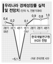 윤 장관은 단정적인 언급을 피하기 위해 ‘가능성’이란 표현을 동원했지만 재정부 내부에서는 이미 확정적으로 결론 내린 상태다. 한 관계자는 “4~5월 상황이 1분기보다 좋을 것이 확실시되는 데다 주식시장과 외환시장이 안정돼 있고 경제주체들의 심리지표도 호전되고 있다.”면서 “여러 사정들을 종합해 볼 때 적어도 올해에는 전분기 대비 성장률이 마이너스로 떨어지지 않을 것”이라고 말했다. 한국개발연구원(KDI)도 지난 14일 올해 분기별 성장률이 1분기 0.1%에 이어 2분기 0.9%, 3분기 0.8%, 4분기 1.0%의 완만한 플러스(+)를 나타낼 것이라고 발표했다.