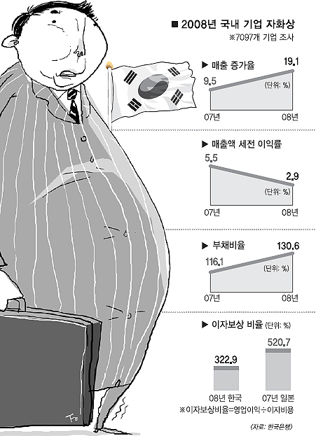 그럼에도 영업이익 등이 줄다 보니 이자 낼 능력이 떨어졌다. 영업이익을 이자비용으로 나눈 이자보상비율은 2007년 363.2%에서 2008년 322.9%로 40.3%포인트 하락했다. 일본 기업들(2007년 기준 520.7%)보다 훨씬 못하다. 제조업체(408.7%)만 떼놓고 보면 이자감당 능력이 일본 제조업체(1007.8%)의 절반도 안 된다.