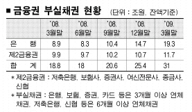 지난해 3월말 18조 8000억원이던 부실채권 규모는 6월말까지 18조원으로 줄어들다가 글로벌 금융위기가 발생하면서 9월말 20조 6000억원, 12월말 25조 4000억원으로 증가세를 보였다. 특히 은행권 부실채권은 19조 3000억원으로 6개월 사이 85.6%나 늘었다. 지난해 하반기 경기가 빠른 속도로 나빠지면서 부실채권이 크게 늘어났다.
