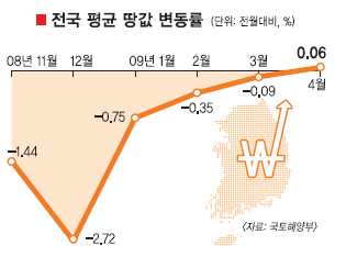 25일 국토해양부에 따르면 지난달 전국의 땅값은 전달보다 0.06% 올랐다. 지난해 11월(-1.44%) 하락세로 돌아선 이후 6개월 만에 오름세로 전환된 것이다. 땅값이 상승세로 돌아선 것은 불안했던 금융시장이 안정을 되찾은 데다가 부동산시장이 바닥권에 진입했다는 인식이 확산된 데 따른 것으로 국토부는 풀이했다.
