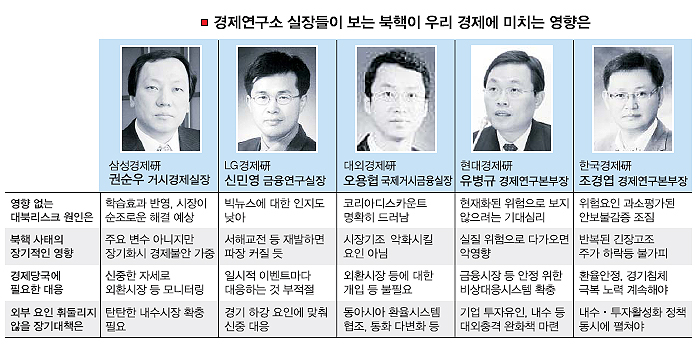 하지만 최근 상황에 대해 경제연구소 실장들은 조금 더 심각하게 바라보고 있다. 신민영 LG경제연구원 금융연구실장은 “과거 북핵사태 때 기업의 장기 수익성에 악영향을 주지 않으면 시장이 금방 회복됐다는 전례가 있지만 최근 상황에 대해 금융시장이 너무 둔감하다는 생각을 지을 수 없다.”면서 “사안에 대한 파장이 어떻게 될지 잘 모른다는 점과 더불어 대북 리스크가 현재 금융시장에 영향을 덜 미치고 있다는 점을 감안하면 우려스러운 현상”이라고 말했다.
