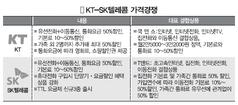 “가격으로 한판 붙자.” 합병KT의 출범을 계기로 KT와 SK텔레콤의 요금경쟁이 본격화됐다. 특히 초고속인터넷·이동통신 등 개별 상품으로 팔던 관행에서 벗어나 여러 통신상품을 묶어서 할인판매하는 ‘결합상품’이 눈에 띄게 늘었다. 소비자들이 보다 싼 요금으로 통신상품을 쓸 수 있다는 것은 더없이 반가운 일이다. 하지만 과도한 가격경쟁으로 결국 더 많은 소비자에게 돌아갈 혜택에 발목을 잡는 것이 아니냐는 우려도 나오고 있다.