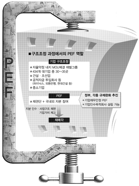 기업 구조조정이 속도를 내면서 사모투자전문회사(PEF)가 주목받고 있다. 우리나라만의 시련이었던 1997년 외환위기 때는 외국자본이라는 구조조정 출구가 있었지만 이번에는 국내 경제, 세계 경제 모두 고비이다 보니 매물로 나오는 기업체들을 흡수할 주체가 뚜렷하지 않다. 이 때문에 시중의 풍부한 자금(유동성) 등을 토대로 한 크고 작은 PEF에 대한 기대감과 역할이 커지고 있다. PEF 활성화 내용을 담은 법안의 국회 통과가 시급한 이유도 여기에 있다.