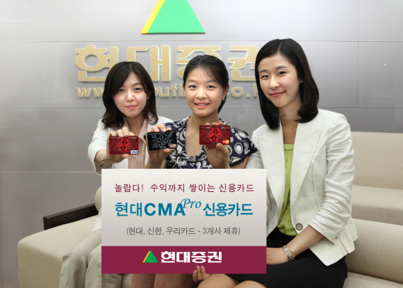 현대증권의 ‘CMA-프로(pro아래)’는 신용대출 서비스가 눈에 띈다. 심사를 거쳐 대출 한도를 부여받으면, 공과금 납부일에 잔고가 부족해도 마이너스 통장처럼 자동 납부돼 연체 걱정을 덜 수 있다. 수익률도 연 2.7~2.8%로 높은 편이다. 이달부터는 현대·우리·신한카드와 손잡고 ‘현대CMA프로신용카드’ 등 6종을 출시했다. 높은 수익률에 다양한 구매·결제 기능은 물론, 현금·체크·가족카드 기능까지 갖춰 별칭이 ‘수익까지 쌓이는 신용카드’이다. CMA 1개에 복수의 신용카드 발급도 가능하다.