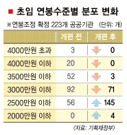 일자리 나누기를 위한 정부의 공공부문 급여조정 방침에 따라 220여개 공공기관의 대졸 초임이 평균 15.3%, 금액으로 440만원가량 깎인 것으로 나타났다. 23곳이나 됐던 초임 3500만원 이상의 ‘신의 직장’은 한곳도 없고, 이전에 전무했던 초임 1000만원대 공공기관이 생겨났다.
