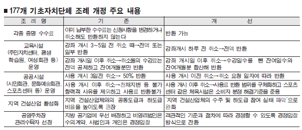 또 공영주차장의 관리 수탁자를 선정할 때 운영 효율성을 높이기 위해 경쟁입찰 방식으로 전환하도록 했다. 견인 대행 및 분뇨처리 업무에서 다른 지역업체의 참여를 제한하고 지역 건설업체 간 과당경쟁을 방지하는 내용의 일부 지자체 조례도 개선된다.