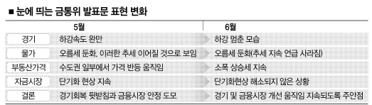 꿈틀대는 부동산시장과 관련해서도 “국지적 현상”(5월 금통위)이라던 데서 “크게 염려스런 방향으로 확산된 것 같지는 않지만 그렇다고 위험이 사그라든 것도 아니다.”(6월 금통위)라며 시중자금의 단기화 현상을 예의주시하고 있다고 밝혔다. 시장에 일종의 암시를 준 셈이다. 일각의 인플레이션 기대심리 대두 조짐을 차단하려는 경고 의도도 엿보인다.