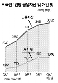 개인의 금융자산은 3월 말 1729조 7000억원으로 지난해 말보다 52조 4000억원(3.1%) 증가했다. 1인당 금융자산도 지난해 말 3451만원에서 올 3월 말 3552만원으로 101만원 불었다. 박종남 한은 자금순환팀 과장은 “소비 위축에 따른 가계대출 감소로 개인부채 증가세가 둔화된 반면 인구가 늘어나면서 1인당 빚이 감소했다.”고 설명했다.