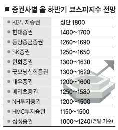 이들 증권사는 하반기 코스피지수가 저점 1200∼1250선, 고점 1580∼1650선에서 움직일 것이라고 내다봤다. 특히 KB투자증권은 ‘V’자형 경기 회복 가능성을 내세워 지수 전망치 상단을 1800으로 제시했다. 반면 삼성·한화·NH투자증권 등은 3분기보다 4분기에 지수가 더 떨어질 수 있다는 비관적인 전망을 내놓았다. 기업 이익 전망이 낮아지고 정부 경기 부양책이 한계를 드러내는 등 실물 경제가 기대에 못 미칠 것으로 우려했다. 삼성증권은 상황에 따라 지수가 1000선까지 밀릴 수 있다고 전망했다.